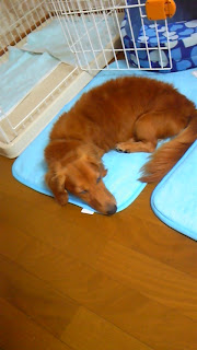 お昼に散歩に出掛けて帰ってきた所ですが、いい感じにリラックスして、私が勉強をしている横で軽く寝ています。フローリングの床にカーペットを敷いたので、よりくつろげる部屋になった感じがします。そんなミントの様子を見て私も本当に嬉しくなります。